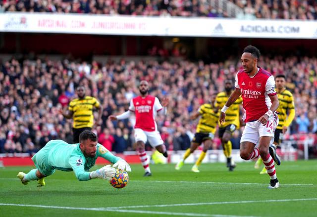 开场仅第8分钟,拉卡泽特在禁区内的背身吊门被福斯特干扰,皮球被奥巴梅扬在禁区截下,可惜阿森纳队长停球稍大,错过了射门时机,一旁的萨卡推射空门得手。不过就在沃特福德回到中圈重新开球之际,VAR也启动了复核程序,慢动作显示,萨卡和球门之间虽然还有一名沃特福德后卫,但由于福斯特出击失位,反而阴差阳错的成功造出了越位陷阱,进球随即被主裁判弗莱德改判无效。