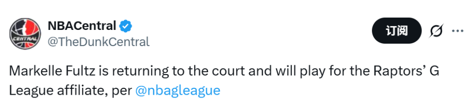 北京时间3月7日,据Sportsnet记者迈克尔-格兰杰报道,多伦多猛龙下属发展联盟球队猛龙905已认领通过豁免认领得到后卫马克尔-富尔茨,这位前状元秀此前已签下一份发展联盟合同。富尔茨是2017年NBA选秀状元,职业生涯因伤病严重受阻,8个赛季里仅为76人、魔术、国王出战255场常规赛。2024-25赛季他代表国王出场21次,场均8.8分钟得到2.9分、1...